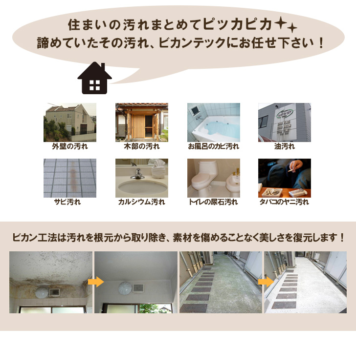 住まいの汚れ、まとめてピッカピカ!諦めていたその汚れ、リペアクリーニングのビカンテックにお任せ下さい!ビカンテックの『ビカン工法』は特殊洗剤でカビ・汚れを根元から取り除き素材を傷めることなく美しさを復元します!防カビ・防菌処理を行う事で人体への影響を配慮でき、美観維持にも繋がります。また、ビカン工法の特殊洗剤は食品添加物に使用される成分と同じものなので人体や動植物にも安心・安全。リフォームするよりも、スピーディで経済的なのも特徴です。リフォーム・塗装する前に是非ご相談下さい♪また、弊社では汚れ落とし・補修後に汚れから守る保護施工『ビカンスーパーコート』をおすすめしています。ビカンスーパーコートのガラスコーティングで建物を汚れ・カビ・酸性雨・紫外線などから守ります。さらに防菌・防カビ・消臭効果や退色防止効果もあるため、キレイがより長持ちします。汚れ落としのご依頼やご相談などお気軽にお問合わせ下さい!