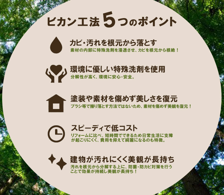 “環境に優しく、素材を傷めることなく美観を維持する”これこそが弊社『ビカン工法』の最大の特長です。