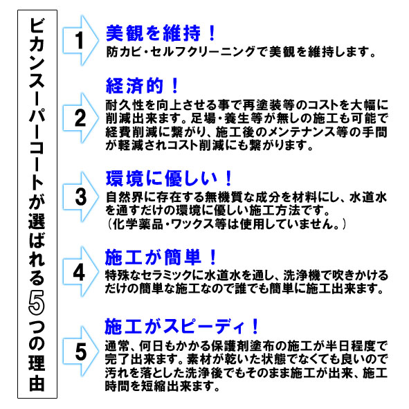 この被膜は親水性で汚れにくく易洗性に優れ、対象となる素材そのものを長持ちさせ、美観を保ちます。 |