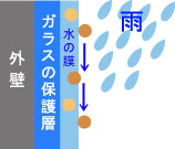 ガラス保護層の親水性+静電気防止効果で出来る水の膜が汚れを浮き上がらせ洗い流します。 |