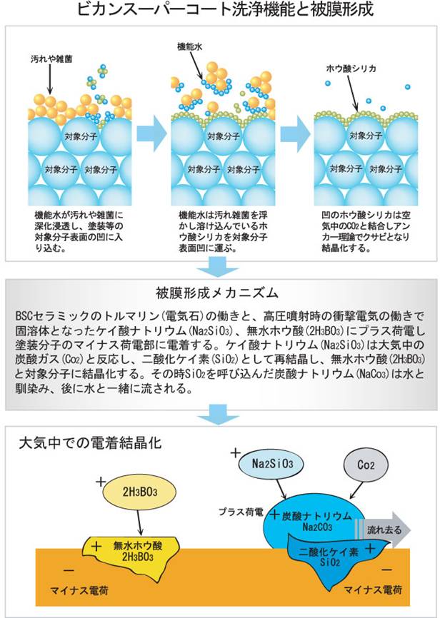 変換された活性水(または機能水という)は、弱アルカリイオン水の働きで洗浄効果を発揮し、専用セラミックから溶出したホウ酸シリカが対象物極表面に100%無機質のガラス被膜を形成させます。