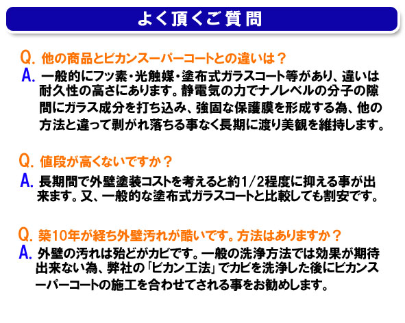 | ビカンスーパーコートは、自然界にある約10種類の鉱物を加工した特殊セラミックの性質特徴を活用し、水を電気分解し、外壁等の表面の凸凹に電気メッキの原理で被膜を作る仕組みを利用しています。従来のケミカル系コーティングは、フッ素等のコート剤を含んだバインダーといわれる接着の役割をするシリコーン樹脂がほとんどで、耐候性に弱く酸化劣化して長期の耐久性に劣ります。ビカンスーパーコートはそうしたバインダーは一切ありません。100%無機質のガラス成分(ホウ酸シリカ)を対象物分子に電着させ空気中の炭酸ガス作用により結晶化します。このガラス分子の結晶化された集合体は、被膜となって対象物分子を被い長期間ガードします。 |