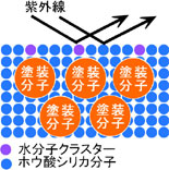 ビカンスーパーコート施工面にはホウ酸シリカの被膜が表面に均一に広がっています。この被膜の分子それぞれに水酸基が付着し、空気中の水分子を吸着するのです。このためビカンスーパーコート施工面はいつも水分子の薄い膜で覆われた状態となり、水になじみやすい、つまり親水状態を保ち続けるのです。 |